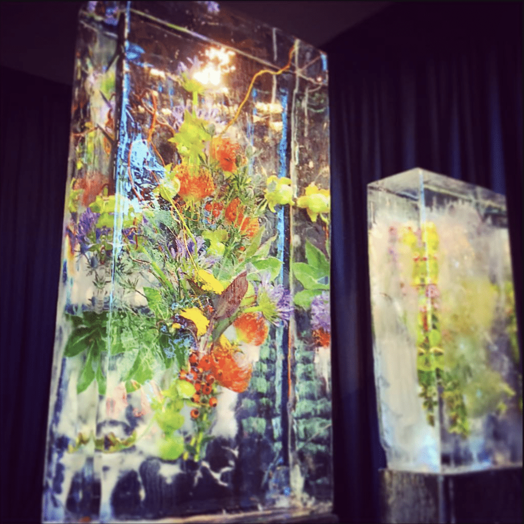 Not all sculptures need to be purely frozen. Freezing fresh flowers, berries or herbs within ice creates a stunning “floral infused” sculpture that marries organic textures with crystalline clarity . These pieces work beautifully for upscale galas or corporate parties where you want to weave the event’s color palette into the decor. Similarly, multifunctional beverage displays combine beauty with utility. A sculpted luge flanked by bottle holders can keep champagne or signature cocktails chilled while providing a dramatic centerpiece for the bar .