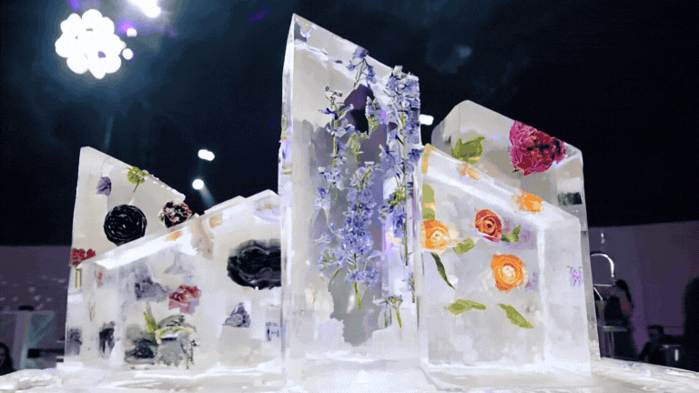 Ice bars, engraved cubes, and sculpted drink displays help keep guests cool as temperatures rise.